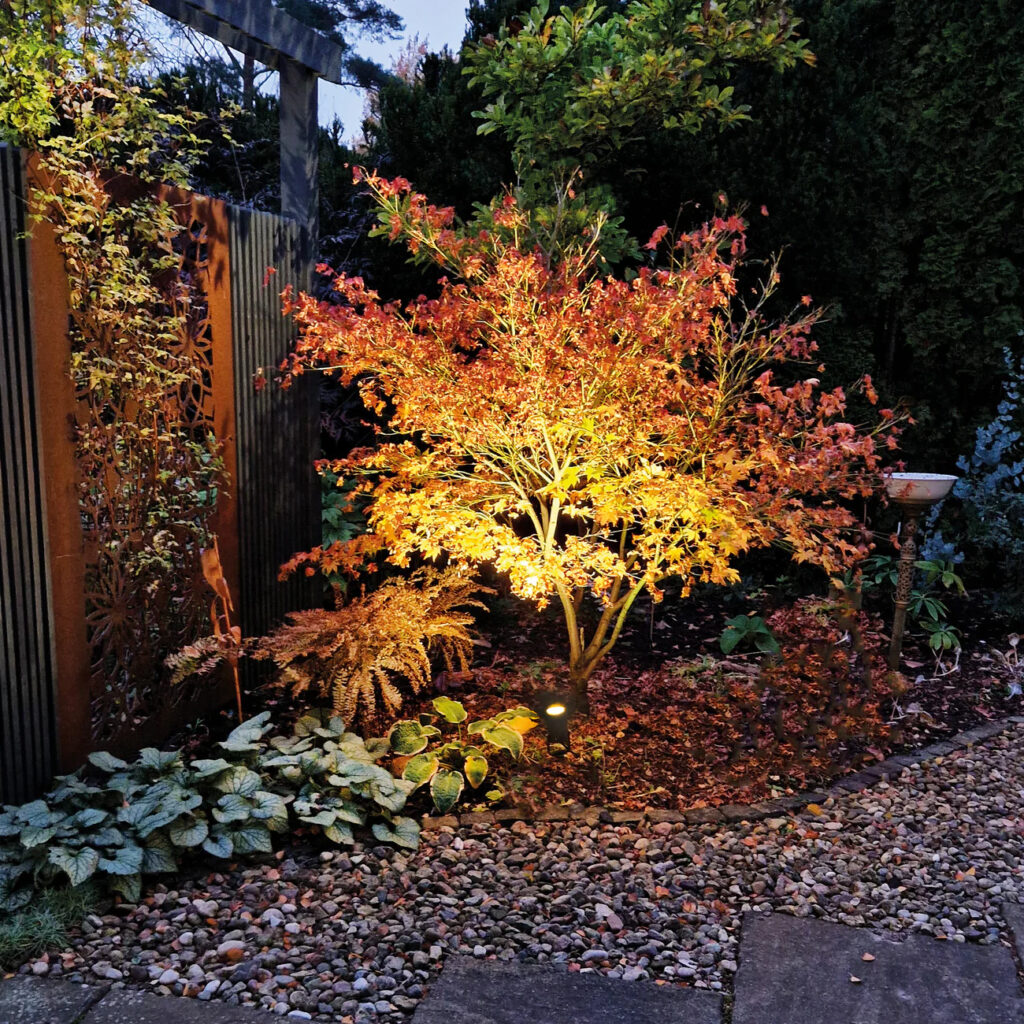 Var noga med att välja rätt färgtemperatur på ljuskällorna så att växterna verkligen kommer till sin rätt. Buskar och träd som har gyllene eller röda blad blir oftast vackrare i ett varmare ljus och vice versa.